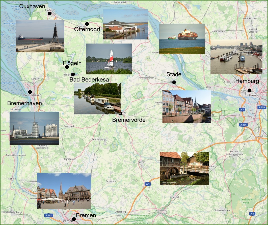 Am Rande liegen Seebadeorte und die bedeutenden Hafenstädte Hamburg, Bremerhaven und Cuxhaven.