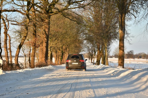 Auf den Landstraßen, wie hier vor dem Wald in Richtung Fickmühlen, bildeten sich unablässig Wehen von windgetriebenem Flugschnee. Die Fahrbahn musste mit Hilfe von Schneeschiebern ständig geräumt werden.