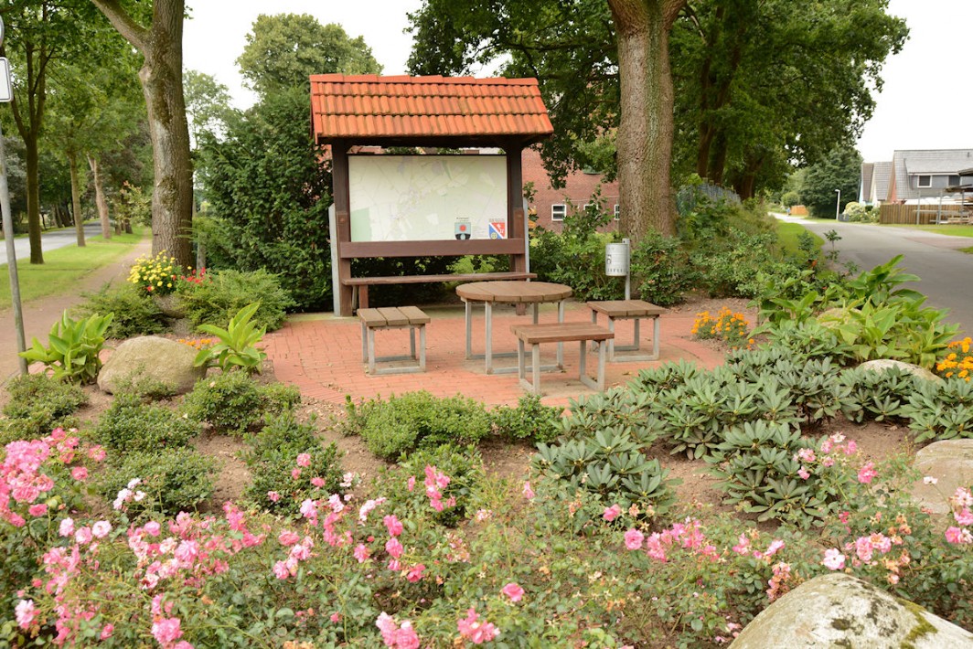 Ein hübsch gestalteter Informationspunkt informiert Besucher und Gäste. Das großzügige Dorfgemeinschaftshaus beherbergt die Kindertagesstätte.